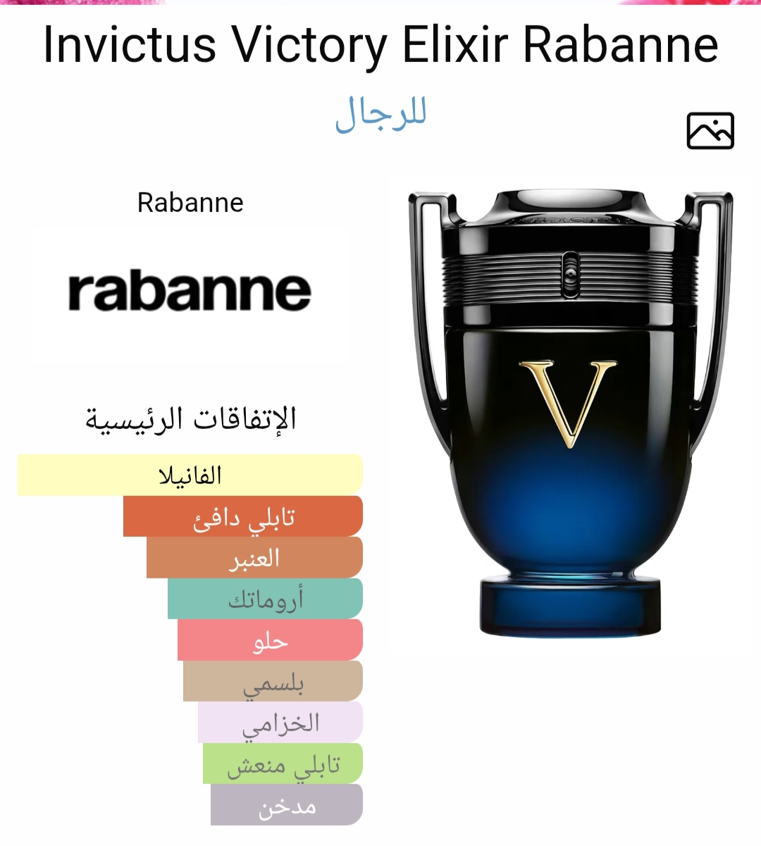 عطر إنفكتوس فيكتوري إليكسير (Invictus Victory Elixir) من باكو رابان هو عطر شرقي خشبي مكثف للرجال، يجسد القوة والجاذبية. أُطلق هذا العطر في عام 2023 ليضيف لمسة من الفخامة والتألق لكل رجل يتمتع بثقة وشخصية قوية