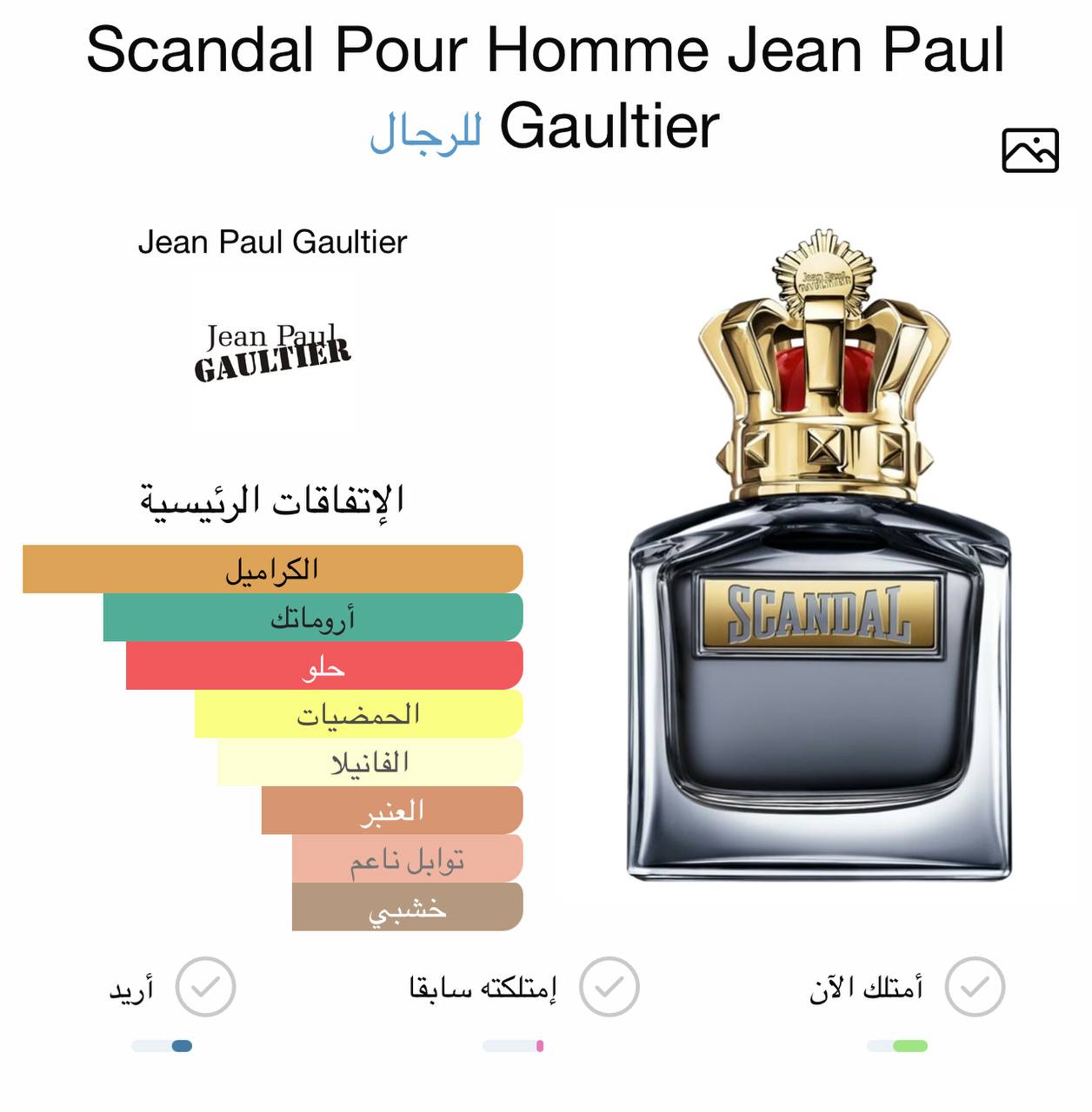 عطر Scandal Pour Homme هو عطر رجالي جريء وفخم، يعكس القوة والكاريزما مع لمسة إغراء واضحة. يبدأ العطر بنفحات المريمية المنعشة والحمضيات التي تعطي إحساسًا حيويًا وقويًا من أول رشة. في القلب يبرز الكراميل الحلو ليضيف عمقًا دافئًا ولمسة مغرية غير متوقعة، ثم يستقر العطر على قاعدة غنية من حبوب التونكا وخشب الفيتيفر التي تمنحه ثباتًا وأناقة ذكورية واضحة.
